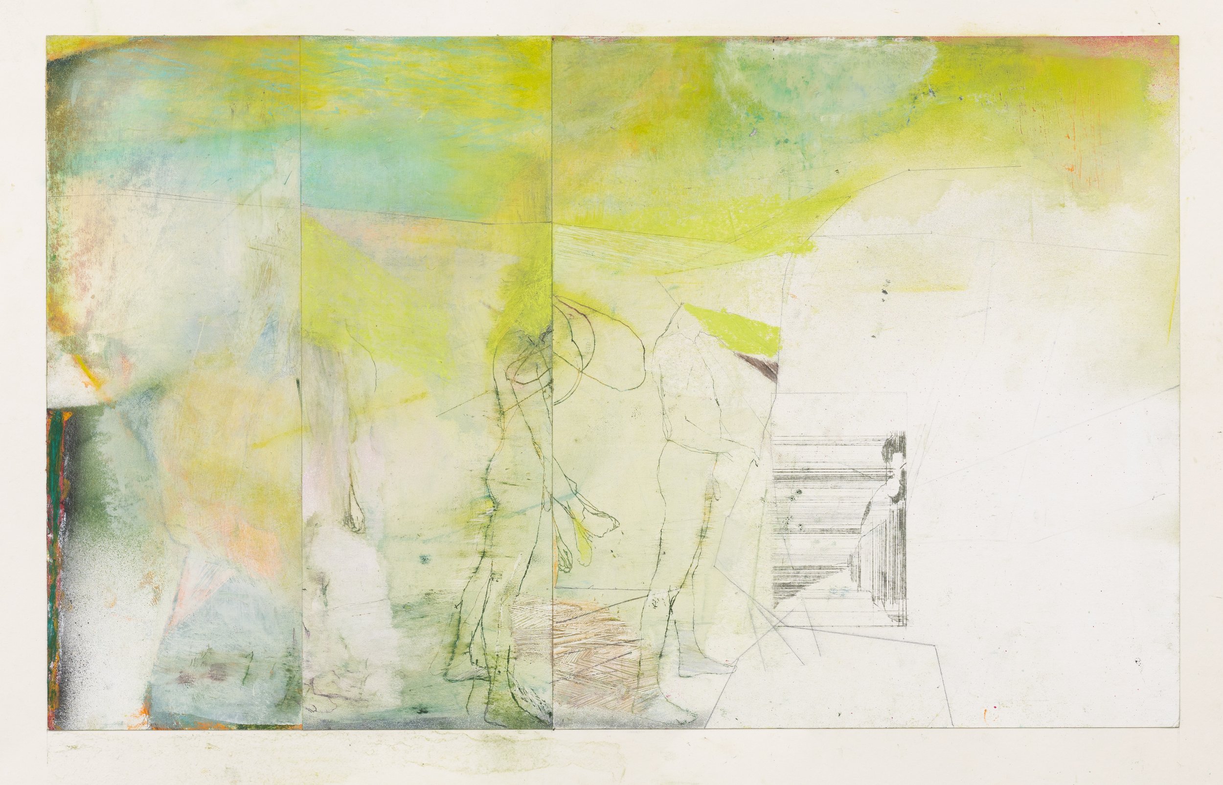 The works on paper assembled here show Mortimer thinking in a more provisional, porous register. The large paintings often arrive with cinematic scale and dread, but these sheets feel closer to the engine room of the practice: lighter, riskier, more fragmentary. Across them, bodies surface and dissolve, often spread across two or three sheets, with empty ground doing as much work as description. Pastel, charcoal, crayon, watercolour, acrylic, enamel, ink and pasted paper all interrupt the authority of oil, so the image feels found, revised and half-remembered rather than declared. That matters because Mortimer's process is built on collage - initially physical, later digital - using found imagery, books, scans and Photoshop as catalysts rather than ends in themselves. In these works on paper, that archaeology is not hidden. It is the subject.